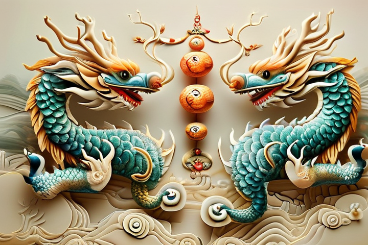 团结与和谐:双龙戏珠的画面中,两条龙相互依偎、共度难关,展现了一种团结与和谐的精神,这种构图方式强调了人与人之间的团结合作、和睦相处的重要性,提醒人们在面对困难时要学会团结一心、共同应对。
